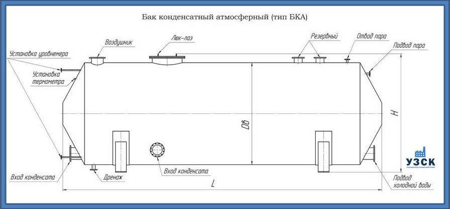 Конденсатный бак в котельной может быть атмосферным (БКА), с внутренним давлением до 0,07 МПа, и напорным (БКН), избыточное давление внутри 0,6 МПа. Именно, в напорном баке происходит вторичный отбор пара пониженных параметров.