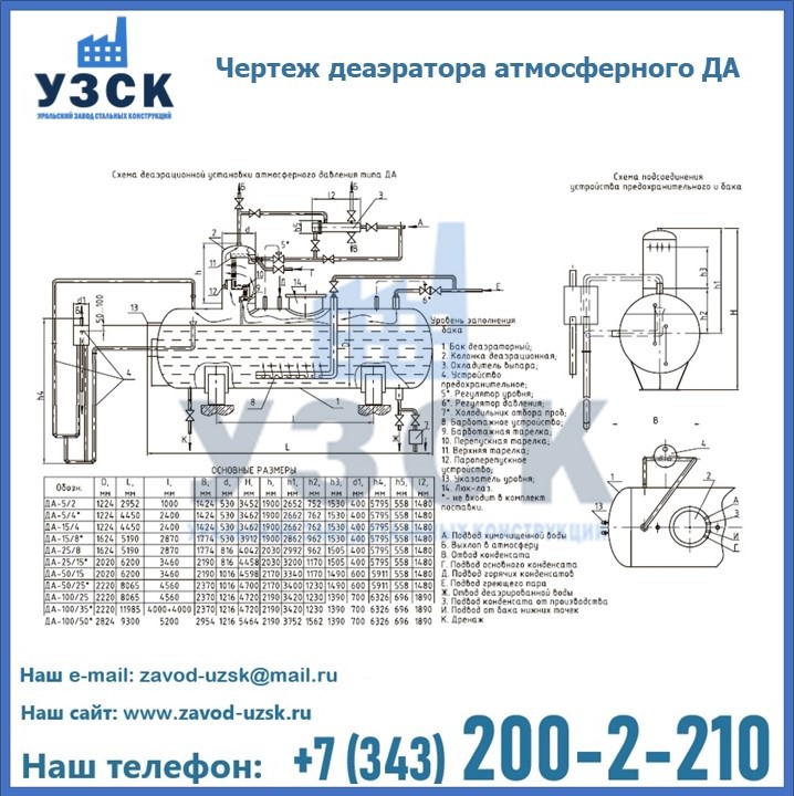 Приобрести качественное оборудование, в том числе, деаэраторы ДА, можно в компании УЗСК в Кульсарах. Мы предлагаем долговечную и надежную продукцию по приемлемой цене. Заказать и купить деаэраторы или другие изделия высокого качества можно через сайт Уральского Завода Стальных Конструкций, или позвонив по указанному в разделе «Контакты» телефону.